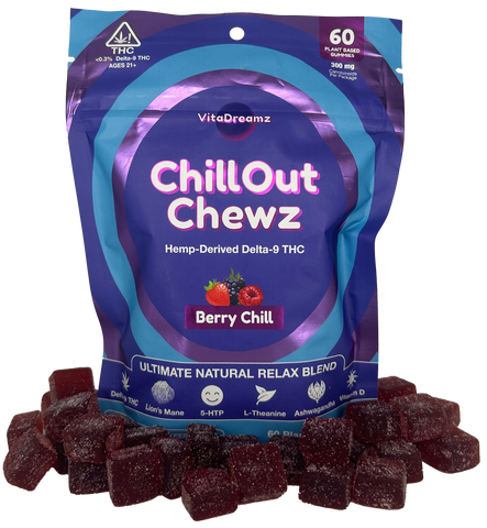 Introducing NEW ChillOut Chewz! A delicious and all-natural relaxing treat utilizing hemp-derived Delta9 THC & other helpful functional supplemental ingredients!